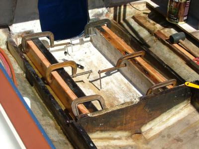 Teardown and cleanout has ended. Reconstruction begins. I've begun to fill in the space between the motor mount stringers with solid wood. Now there will be some meat for the outboard motor mount bolts to bite into. It is hard to get a machine fit on these inserts so when completed I will litteraly fill any gaps with liquid epoxy.