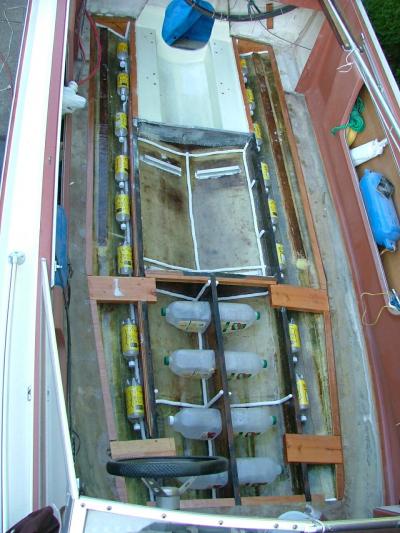 Hmmm! What's going on here? Looks like the City's recycle yard. This was the result of an extensive iboats think tank operation. The object was to provide waterproof bouyancy while reducing the cost of expensive foam.
