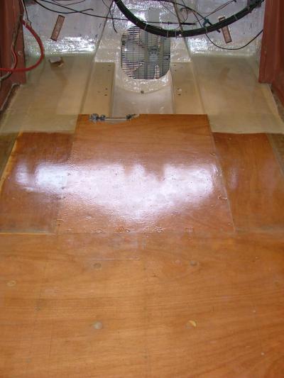 The gas tank panel has been installed, the whole middle section of the floor has been glassed over and the whole floor has received it's second coat of epoxy.