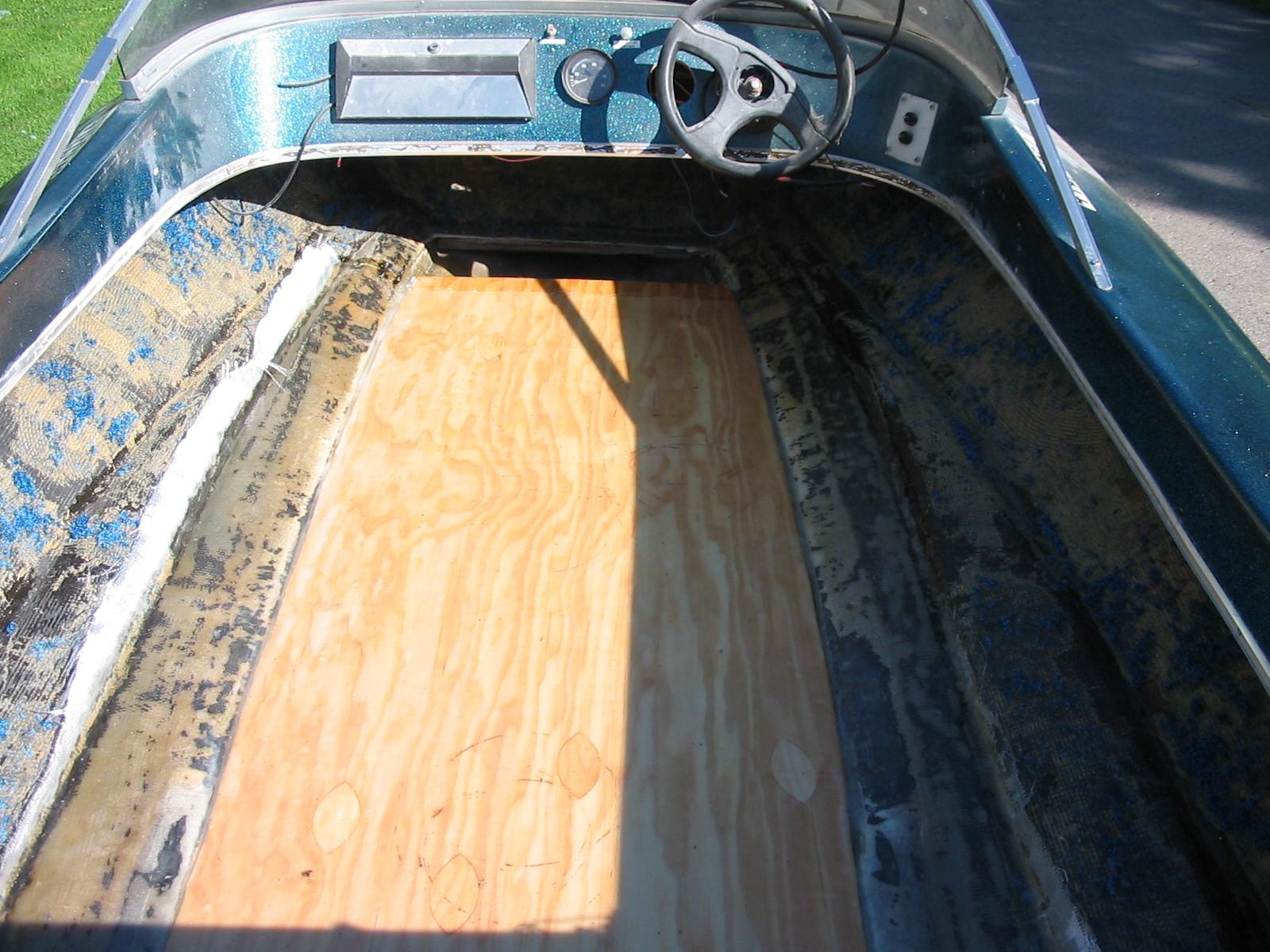 the first portion of floor was laid in with the deck still attached to ensure no deformation problems in the hull. Only the first layer of cloth on here.