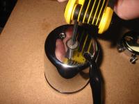 Run the wires out the hole in the bottom of the cup and install the tach into the cup. Use the provided flush head screw to hold the tach in place (5/32" allen). I used Blue Loctite.