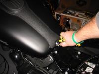 There is room just inside that left tank mounting tab to bring the wire down through a hole. This is important so you keep the wire clear of the mounting tab on the front of the seat. You'll slide that seat tab under this bolt in the center, so that wire needs to be off to the side to avoid threat of being cut or damaged.