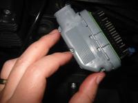 On the under side of the ECM connector is a release tab. Press the release tab and pull the connector free from its socket.