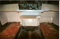 Looking forward between the consoles, the structure is coming together. All the big parts are tabbed in and ready for epoxy and cloth. Take a look at the patch I needed to make for the dashboard. It was originally sawed right thru from the factory to make room for the wiring. No wonder it sagged...