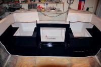 Finally they're done. The 2 parts I molded are now bonded into place and faired into the surrounding structure. The painting was tedious; 5 coats of black, lots of wet sanding and polishing. I got a little crazy and added the mahogany inlays (with 7 coats of varnish, more polishing....) but the end product is worth it. It will kill me to cut holes for gauges, switches, steering,etc.