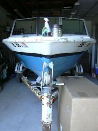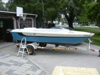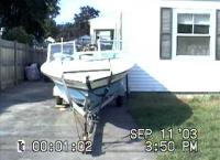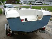 As found, October 2003, in Rhode Island. Found the boat in eBay and talked the wife into a weekend road trip. Came with a blown Chrysler 85hp that I parted out for enough money on eBay to cover the cost of the boat & trailer, plus most of the road trip gas money!