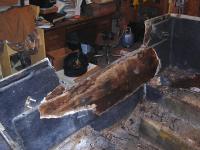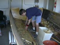 My son gets into the clean-up as we move on to getting the stringers and keel out and new ones in. The last of the foam has to come out first!