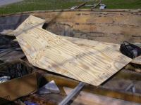 Mrch 2005 - A new piece of transom! On this boat I used three layers of 1/2-inch plywood to achieve the 1.5-inch thickness. Alternating plywood with glass cloth to act as a wick for the epoxy. I taped a large sheet of newsprint to the outer skin of the transom to create a template, then trimmed to fit. It didn't need to be perfect as the epoxy tends to fill gaps quite well.
