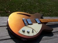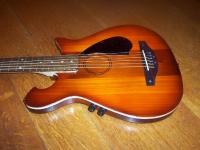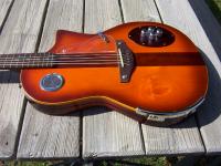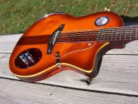 The pickguards....There was some damage to the top from the bridge removal. I filled it, sanded it and shellaced it, but didn't like the way it looked. So...I decided to make mirror image pickguards to hide it. I used a smoked acrylic which came from a cracked sun visor off a CaseIH sprayer. My granddaughter says the pickguards look like puppy dog ears.