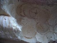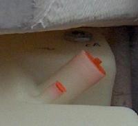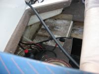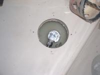Of course, there is a big block of foam right where I wanted to put the 3 way fuel valve. Foam is not easy to remove, but using a 3" hole saw in the cordless drill made things a lot easier. Here the round hole saw marks can be seen where the foam was removed. This shot is taken looking straight up from the floor under the transom cap.