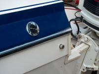 Tank fits very nice in the space where the old 9 gallon tank fit. And the filler neck clears everything. Hard to tell from the angle of the photo, but the neck is exiting the splashwell while still under the transom, so none of the fill hose/pipes will be sticking out. Also, only a small portion of the tanks corners extend past the splashwell, no more exposed than the old tank. That makes it easier to build an enclosure to hide the tank. Note location of the fill and fuel line connector.