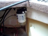 Mounted the fuel filter to the side of the plashwell under the gunnel. Through bolted with 3/8" stainless carriage bolts and locking nuts. The battery box mounts to the left of the filter with plenty of space to reach in and change the filter cartridge.