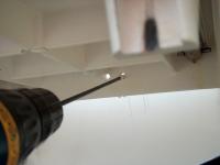Measured, apply masking tape, marked and drilled holes for the hardware. Note tape on drill bit as depth gauge.