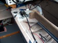 The side panel is fit back in place. The helm end of the wire harness with ignition switch and gauge connections can be seen under the dash.