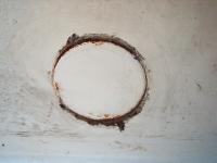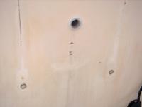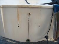 This is what the transom looked like after removing the Force outboard. The lower bolt holes have to be filled with epoxy and the drain tube from the splashwell is broken on the splashwell side and needs to be replaced.